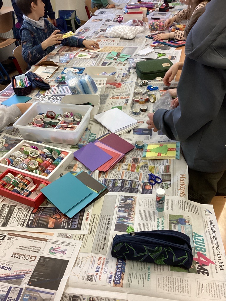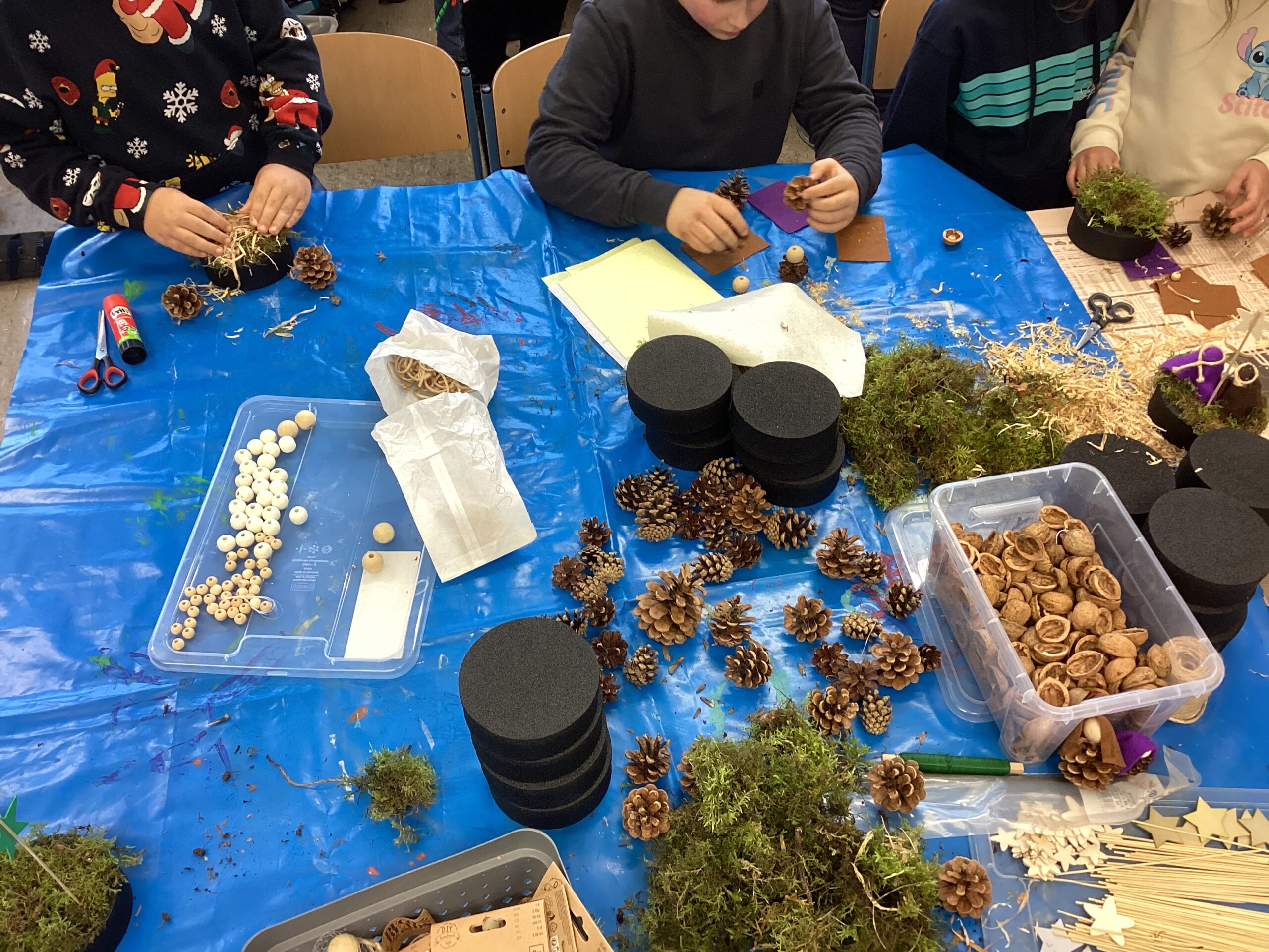 Am 5. Dezember fand unser diesjähriges Nikolausbasteln statt. Jedes Jahr bereiten viele Eltern Bastelstationen für unsere Grundschüler vor: so wurden z.B. Karten gestaltet, Gläser bemalt oder beklebt, Krippen aus Moos und Tannenzapfen gebaut, Sterne aus Perlen gefädelt, Christbaumanhänger aus Papier gestaltet und Kerzen oder kleine Häuschen aus Keksen gebaut. Im Schulhaus herrschte eine fröhliche und lockere Atmosphäre. Es machte Eltern und Kindern gleichermaßen Spaß. An dieser Stelle bedanken wir uns nochmal bei den vielen helfenden Händen und dem Vorbereitungsteam. Die Schüler waren sich einig: so einen Tag könnten wir öfter machen.